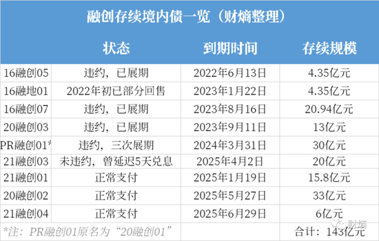 境内债方面,融创目前存续有九笔。自2022年5月13日宣布第一笔境内债违约以来,融创累计已有四笔境内债违约(16融创05、16融创07、20融创03和PR融创01)。