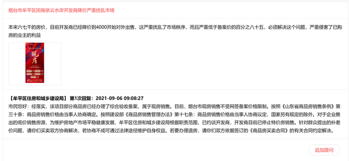 2021年8月,曾有业主在胶东头条网上民声栏目反应“招商依云水岸项目从单价6000元~7000元/平方米降价到4000元/平方米出售,扰乱市场秩序”。同年9月,烟台市牟平区住房和城乡建设局回应表示,烟台市现房销售不受网签备案价格限制。对于企业推出的低价销售房源,为维护房地产市场平稳健康发展,牟平区住房和城乡建设局已约谈开发商,开发商已停止特价房销售。