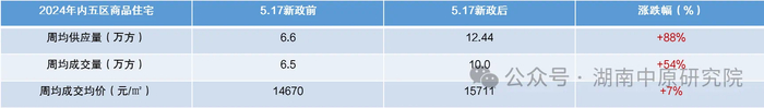 数据显示,“517”楼市新政之前,长沙市内五区商品住宅周平均供应6.6万平方米,成交6.5万平方米,成交均价14670元/平方米;“517”楼市新政实施之后,长沙市内五区商品住宅周平均供应12.44万平方米,成交10.0万平方米,成交均价15711元/平方米,分别环比增长88%、54%、7%。