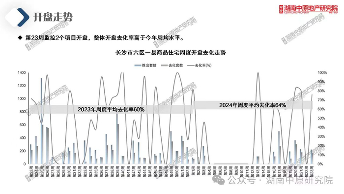 目前,长沙市内五区在售的商品住宅项目约138个。长沙市六区一县商品住宅周度开盘去化走势显示,2023年周度平均去化率为60%,今年以来周度平均去化率为64%。