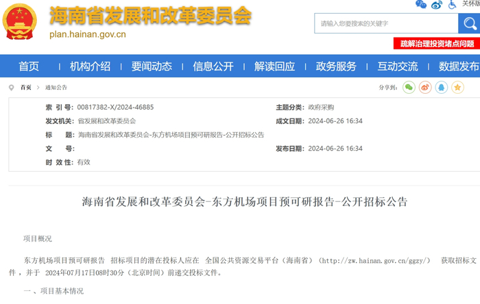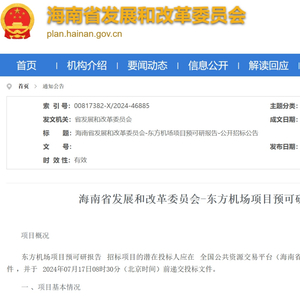 最近,海南省发展和改革委员会在其官网发布《东方机场项目预可研报告-公开招标公告》,将对东方机场项目方案进行进一步的技术经济论证。这标志着东方机场项目建设再迈一大步。