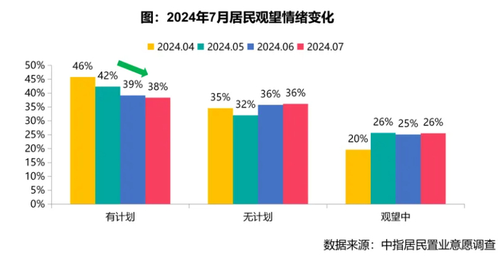 7月居民购房观望情绪仍持续高位水平,观望占比约为26%,较4月份上升6个百分点,仍处于相对高位水平。一方面是等待更优惠的政策支持,另一方面是等待房价降至合理区间,降低居民购房支出。