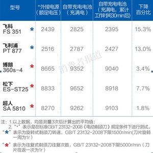 结果显示,在标准规定的“额定电压”测试状态下,飞科、飞利浦两款旋转式剃须刀的额定转速及博朗、松下、超人3款往复式剃须刀的额定往复次数均远远高于标准中的限值。