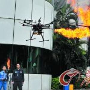 广州供电局用喷火式无人机来清除悬挂物。