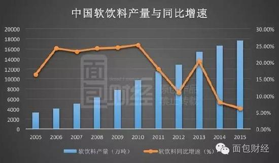 最近三年来,饮料产量增幅已经在持续放缓。增速从2013年的约20%,急速放缓到去年的6.2%。下图是面包财经(微信公众号ID:mbcaijing)根据官方数据绘制的中国近年来饮料产量图: