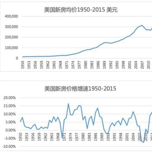 下面两张图表分别描述从1950 年到2015年,美国住宅每套的均价和每年的价格涨幅: