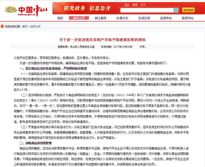 3月26日,中山市发布《关于进一步促进我市房地产市场平稳健康发展的通知》(以下简称“《通知》”)。《通知》从落实商品住房价格备案审查,严格明码标价制度;加强商品房预售管理;实行住房限购及差别化信贷政策,加强对商品住房销售的金融监管;加强房地产中介市场整顿;加强房地产市场舆论引导等五个方面,对中山楼市做出了进一步规范。