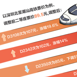 那么调价就是涨价吗?其实并不是。工作人员介绍说,以深圳北至潮汕的高铁票价为例,调整前二等座执行票价为89.5元,调整后同样区间,D3108次为107元,涨幅19.6%;D2342次为102元,涨幅14%;D2350次为85元,下调5%;D7406次为73元,下调18.4%。