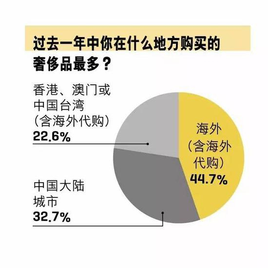 《财富》(中文版)调查发现,2017年受访者购买奢侈品最多的地方依次为:海外(44.7%)、中国大陆城市(32.7%)以及港澳台地区(22.6%)。可以看到,对于中国消费者而言,海外购买仍为主力,这个数字比三年前增长了17.7个百分点;而相比之下,在中国大陆城市以及港澳台地区的购买比例则分别减少了0.1及3.9个百分点。此外,在“中国大陆以外地点购买奢侈品”的主要原因调研中,占比最高的三者依次为:“价格更优惠”(47.8%)、“正品保证”(31.5%)、“产品的范围更大和选择更多”(12.9%)。