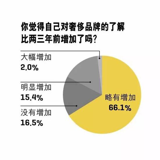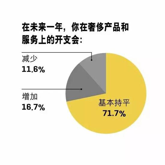 据汇丰银行预测,2017年的奢侈品行业将出现并购大潮,路易威登集团、蔻驰集团以及开云集团是进行收购可能性最高的三家企业。但是,谈及去年用于购买奢侈产品和服务的支出占比,达到家庭总收入11%~20%的人数达到了33.3%,较去年提高了3.7个百分点;对于在未来一年里对其的开支预算,71.8%的受访者表示将会“基本持平”。而在对品牌的认知及了解程度方面,66.1%的受访者则表示“略有增加”,较去年提升了2.3个百分点。