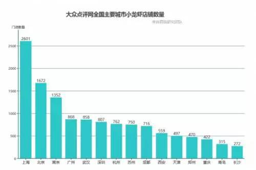 小龙虾馆也以惊人的数量野蛮生长,2016年一线城市平均开业 500+(店),二线城市 200+(店),三线城市及以下 30+(店)。仅2016年第二季度,小龙虾专营店新增数量同比上涨33%,截止 2016 年 8 月,大众点评网上关于小龙虾的总餐馆数已高达 17670家,是大街小巷随处可见的串串香店数目的2倍,是肯德基中国门店数量的3倍。热门城市分别如下: