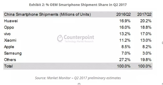 Counterpoint最新发布的调研报告称,2017年第二季度,中国手机市场的出货量同比增长了3%。具体到各个厂家,华为、OPPO、vivo、小米排在中国市场的前四位,分别达到了为20.2%、18.8%、17%、13%。这四家公司在中国市场占比的总和已经达到69%。