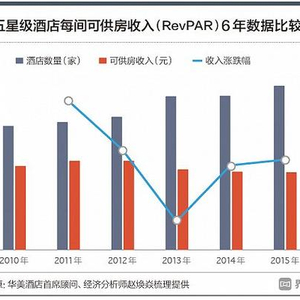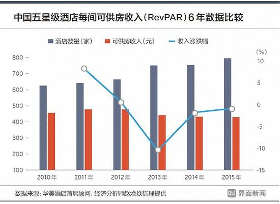 类似于经济型酒店在国内的发展轨迹,五星级酒店也在过量扩张的同时,面临收益下降。根据国家旅游局监督管理司报告,2011年,全国615家五星级酒店,每间可供房收入430元,达到近年来的顶峰。2015年,全国789家五星级酒店,每间可供房收入降到369.84元。