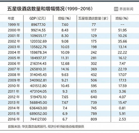 与此同时,从1999年到2016年,全国五星级酒店数量增长了10倍,达到809家,其中增长最为迅速的时期在2010年之前。每隔两三年,都出现一个五星级酒店数量增长的高潮。行业研究认为,国内生产总值上升1%,酒店业市场可以上升0.914%。而数据统计显示,从1999年起,除2006年、2011年、2012年、2014年至2016年,其余年份国内五星级酒店的增长速度都超过国内GDP增速。