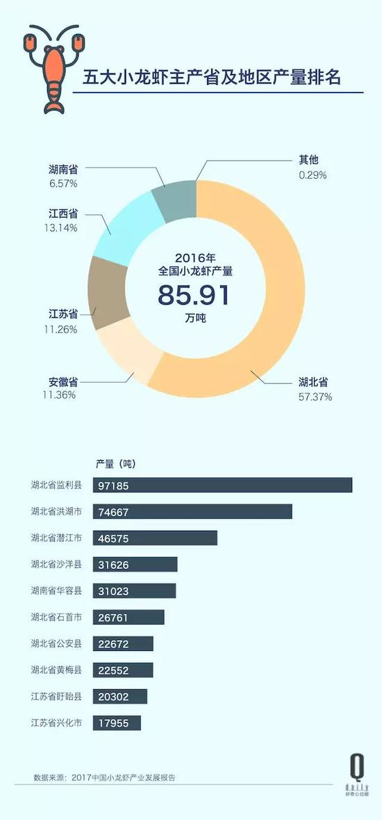 全国的小龙虾就这样错综复杂地运送到需要它们的水产市场和餐厅老板手里。根据农业部发布的《中国小龙虾产业发展报告(2017)》,去年中国小龙虾养殖产量为 85.23 万吨(不含捕捞),超过全球产量的七成。年产 2.03 万吨的盱眙仅排全国第 9 位,范保林一年经手的货还不到盱眙的 3%。