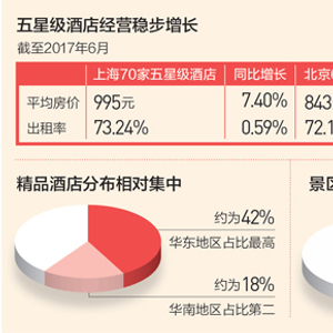 据媒体报道,上海、北京两地旅游局的数据显示,五星级酒店的主要经营指标近两年稳步增长。截至2017年6月,上海70家五星级酒店的平均房价、出租率分别为995元、73.24%,同比增长7.40%、0.59%;北京61家五星级酒店的两项指标分别为843元、72.10%,同比增长12.93%、4.19%。