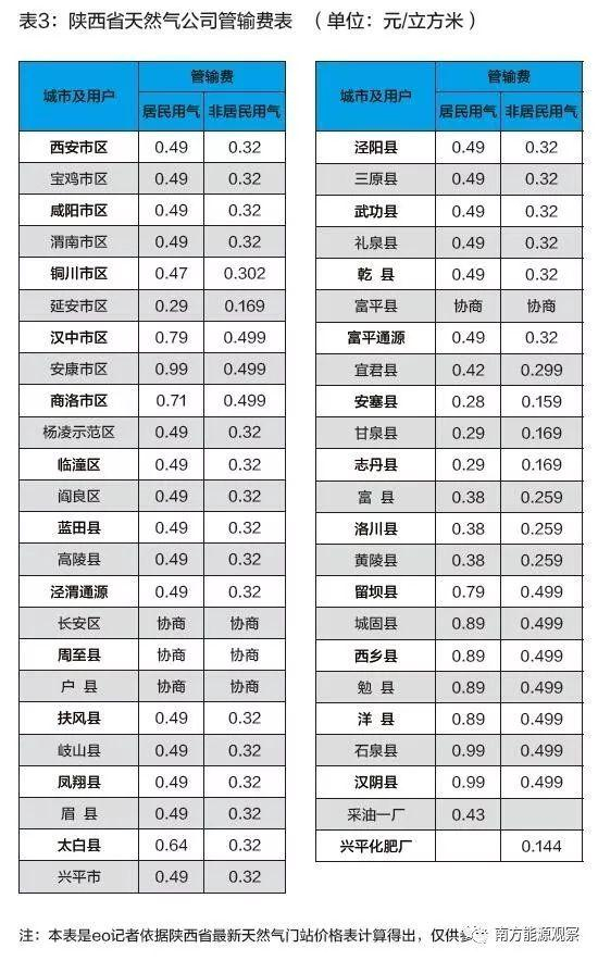 下调后全省管输费基本情况为:延安以北居民管输费为0.29元/立方米,非居民为0.169元/立方米;关中地区居民用气管输费为0.49元/立方米,非居民用气为0.32元/立方米;而陕南汉中、安康、商洛的居民用气管输费分别为0.79元/立方米、0.99元/立方米和0.71元/立方米,非居民的管输费同为0.499元/立方米(详见表3)