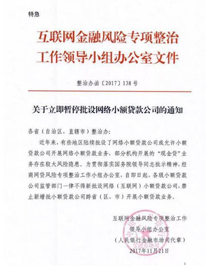 11月21日下午,互金风险专项整治工作领导小组办公室下发了《关于立即暂停批设网络小额贷款公司的通知》(以下简称《通知》),要求各级小额贷款公司监管部门一律不得新批设网络(互联网)小额贷款公司,禁止新增批小额贷款公司跨省( 区、市) 开展小额贷款业务。