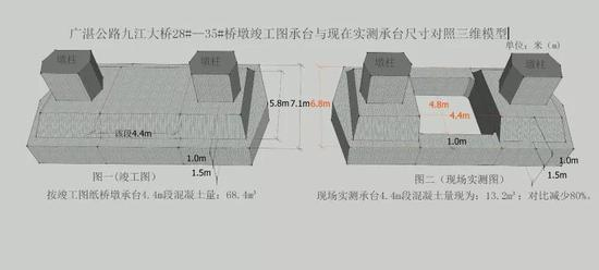 此次石桂德举报的情况是大桥26#-35#桥墩承台空心,且承台宽度相比竣工图少了0.3米,每个承台挖空部分55.2立方米,合计少用混凝土量58.7立方米。承台是连接桩与柱或墩的关键部分。承台把几根,甚至十几根桩连接在一起形成桩的基础。