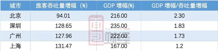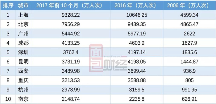 这在很大程度上也可以解释为何过去10多年,深圳机场客流量的增速,与城市经济发展增速出现偏离。以下是一线城市,过去10年机场客流量增幅与GDP增幅对比表(2006年—2016年):
