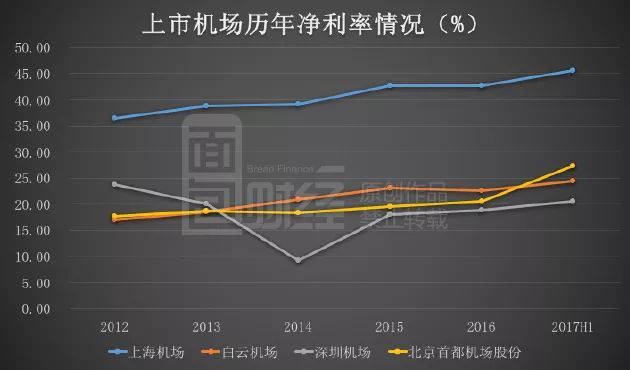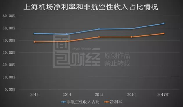 上海机场的非航空性收入占比从2013年的45.66%上升至2017年上半年的53.75%,与此同时,净利率也在同步增长,从38.79%上升至45.59%。