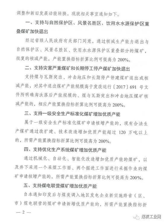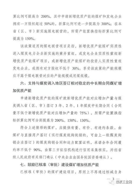 支持一级安全生产标准化煤矿、优化生产系统煤矿、煤电联营煤矿、与煤炭调入地区签订相对稳定的中长期合同煤矿增加优质产能。 上述几类煤矿的所需产能置换指标折算比例可提高为200%。