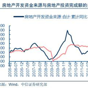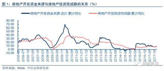 房地产开发资金与房地产投资具有较明显的一致性和滞后性。从资金来源和投资同比增速的峰谷值看,二者走势较为一致,但房地产投资滞后于获得资金大概3~9个月。大部分时期内,投资完成额增速的变动幅度小于开发资金来源。开发资金增加较多的时候,如2010年上半年和2013年下半年,投资增速一般有所提高,但提高幅度不如资金来源的增速;反之,当资金来源增速下降时,投资完成额增加值往往也会随之明显出现下降。这种走势出现的原因可能是,房地产投资的资金来源主要为销售收入,当销售收入大幅增加时,房地产企业将收入再次投向新建楼盘的比例下降,因此投资增速低于获得资金增长率,而企业获得资金较少的时候,可用于再投资的资金比例并不会明显上升,更会压缩未来投资增速。这就解释了数据走势的特点,投资额易低不易高,并且存在明显的滞后性。如果假设滞后期为6个月,2016年下半年15%左右的资金来源增速对应了2017年上半年9%左右的投资增速,而2017年上半年11%左右的资金来源增速对应了7%%左右的投资增速,我们不妨做一下预测,2017年下半年房地产开发资金来源增速在7%~10%且不断下行,那么2受此影响2018年上半年投资增速可能在3%~6%左右的水平。我们将在第三部分计算2018年房地产开发资金增速变化,从而估计房地产投资增速的走势。