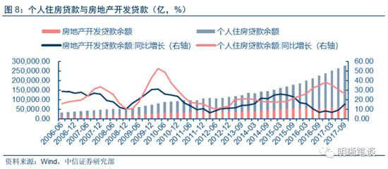 商业性房地产贷款增速缓慢下降,主因是个人住房贷款增速下降。2017年房地产贷款的增速出现下降,从2016年12月的27%下降至2017年9月的23%,主要源于购房监管趋严,发放贷款要求更高。其中个人住房贷款增速下滑明显,与此同时房地产开发贷款增速出现上升,从结构上解释,说明购房者贷款增加放缓,但地产商贷款需求增加。目前房地产调控政策不太可能放松,个贷增长率或将继续下滑,对应的开发贷增长率还会有所上升,但预计上升幅度可能没有2017年快。预计2018年一季度的房地产贷款总额33.5万亿~34万亿,其中个贷和开发贷总额分别为7.5万亿和22.5万亿。