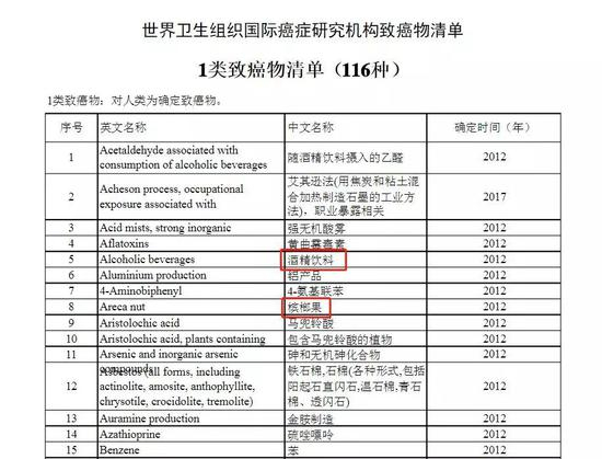 世界卫生组织国际癌症研究机构公布的致癌物清单中,证据最确切的 1 类致癌物清单中,槟榔多次出现,而酒精及其相关产物也赫然在列。