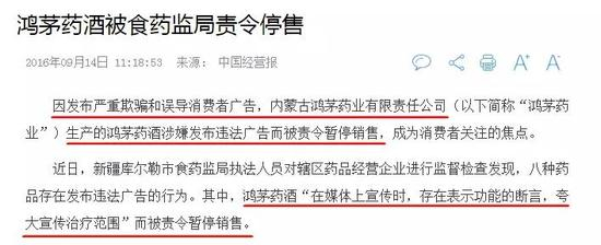 报道显示,在过去 10 年间,据不完全统计,鸿茅药酒广告曾被江苏、辽宁、山西、湖北等 25 个省市级食药监部门通报违法,违法次数达 2630 次,被暂停销售数十次。