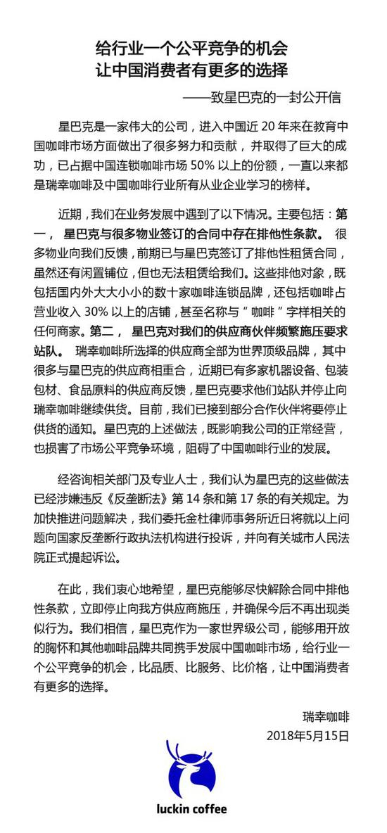鉴于星巴克涉嫌垄断的行为,损害了咖啡行业的公平竞争秩序,也阻碍了瑞幸咖啡的正当经营活动,瑞幸咖啡就星巴克涉嫌垄断的行为,拟向有关法院提起民事诉讼,并同时向国家反垄断行政执法机构进行投诉,请求司法和执法机关责令星巴克立即停止垄断行为,包括但不限于立即解除与合同相对方签订的排他性条款,不得继续与合同相对方签订排除、限制正当竞争的排他性条款。与此同时,瑞幸咖啡今后会继续与潜在的店铺出租业主、原材料供应商等密切合作,搜集星巴克涉嫌垄断行为的证据,并基于新的事实,适时行使诉权和请求权。起诉和投诉本身不是目的,我们的目的是以此为手段,遏制垄断行为,净化市场环境,维护竞争秩序,促进中国咖啡行业健康发展。