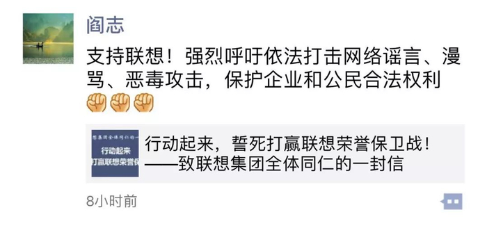 卓尔控股有限公司董事长阎志也在朋友圈表态支持联想!他强烈呼吁依法抨击网络谣言、谩骂、恶毒攻击,保护企业和公民合法权利。