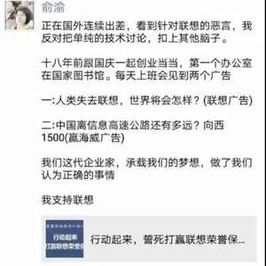 当当董事长,联合创始人俞渝表示:看到针对联想的恶言,“我反对把单纯的技术讨论,扣上其他帽子。”“我们这代企业家,承载我们的梦想,做了我们认为正确的事情。”“我支持联想。”