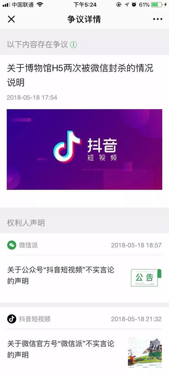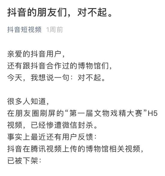 抖音短视频的官方微信号发布了《关于博物馆H5两次被微信封杀的情况说明》。