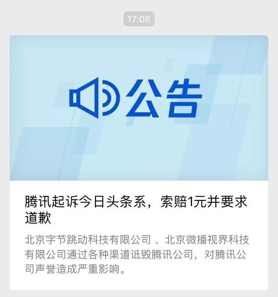今天17:08,腾讯发布公告称:腾讯起诉今日头条系,索赔1元并要求道歉。