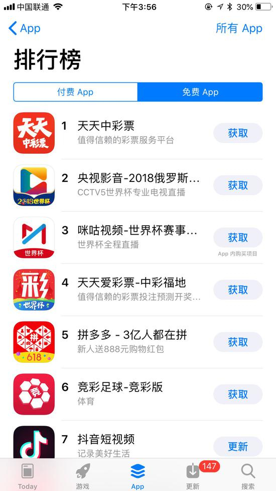随着2018年俄罗斯世界杯的开启,21世纪经济报道今日在App Store免费榜单上看到,互联网彩票App的排名变动非常大,以前进榜单的相关App都寥寥无几,如今,排名前十的App中就出现了三家互联网彩票公司。