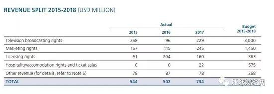 在3月18日发布的FIFA 2017财政报告中,国际足联2017年在全球范围内收入总额为7.34亿美元,其中电视转播权的转让收入为2.29亿美元,营销收入超过电视转播为2.45亿美元,FIFA周边产品授权所获也已高达1.6亿美元。