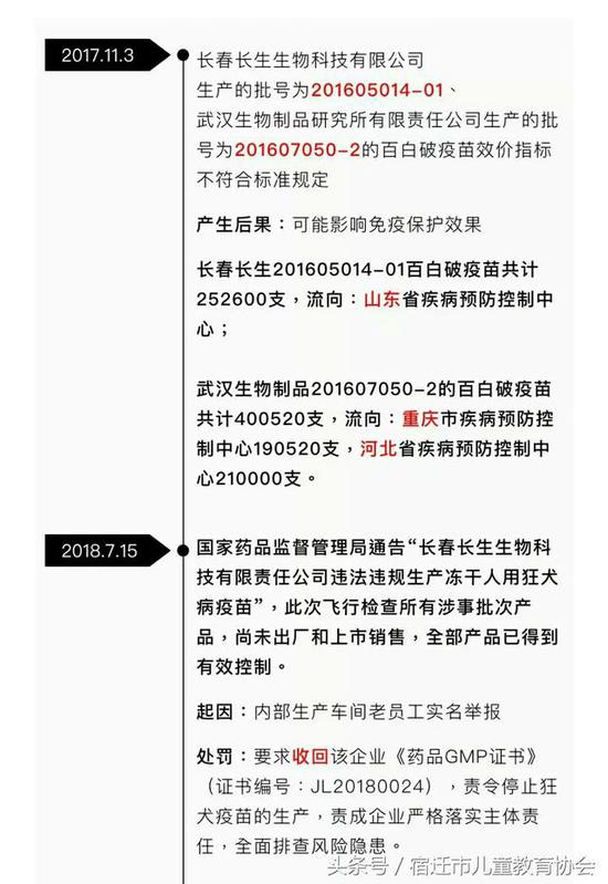 其实在2017年11月,食药监局公告了两家百白破疫苗生产公司,共计65万多支百白破疫苗不合格。除了长春长生的25万支疫苗(主要流向了山东),武汉生物制品的不合格产品量更大--40万支(批号为201607050-2)。其中19万支流向重庆,21万支流向了河北。所以如果你是这两地的妈妈,你也要查一下你的疫苗本,看一下有没有中招。