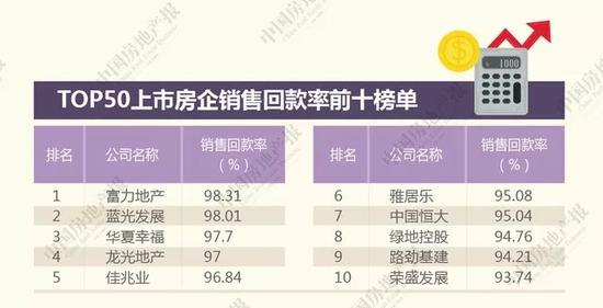 从TOP50上市房企销售回款率前十榜单可以看出,除了恒大和绿地控股外,其他多为奔千亿的房企,如蓝光发展、龙光地产、雅居乐等,销售回款率均在95%以上,其中富力地产以98.31%夺得回款率第一。