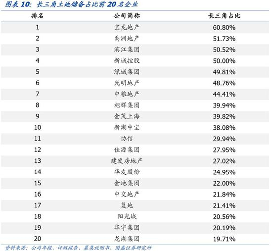2016年6月,发改委和住建部联合印发《长江三角洲城市群发展规划》,目标在2030年,将长三角城市群打造成具有全球影响力的世界级城市群。长三角城市群,作为城市化水平较高、发展潜力巨大、产业最活跃的区域,受到众多房企的聚焦。其中,宝龙地产、禹洲地产、滨江集团及新城控股均有50%及以上土地储备分布于长三角地区。