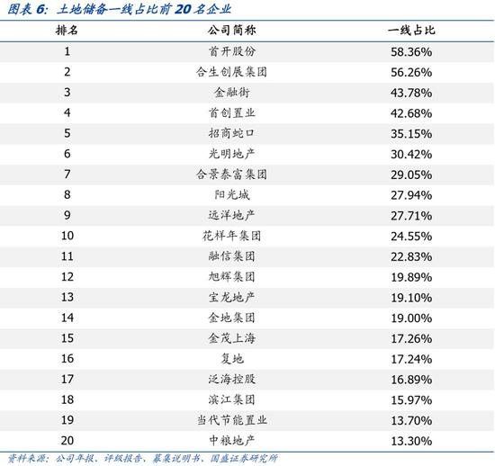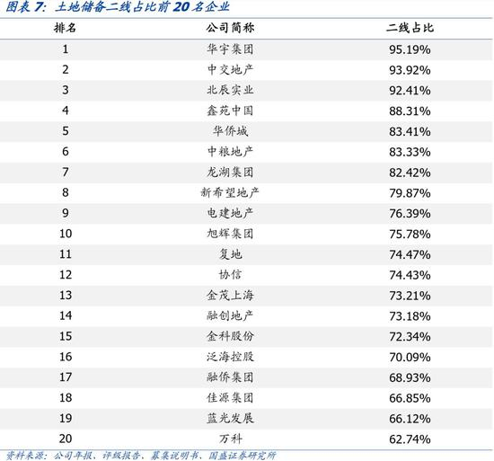[1]由于缺少恒大地产、碧桂园、华润置地详细的一二、三四线城市分布数据,因此土地储备按城市等级占比排名不予考虑。