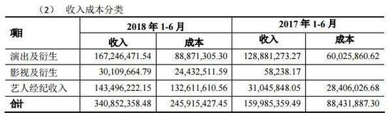 由2018年半年报清晰可见,演出及衍生这部分收入,较上年同期增长了29.77%,达到1.67亿;艺人经纪项目相关收入高达1.43亿,较上年同期增加362.21%。反观电影方面,只有3000余万元收入。
