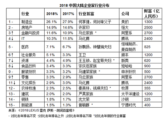 《2018年胡润百富榜》数据显示,六成上榜者主要财富来自制造业、房地产、金融投资和IT这四大行业。其中,房地产行业排第二,占比从去年的14.6%略升至14.9%,十年前,这一数字则为24%。胡润指出,“房地产行业在榜单的前15年里都排第一,但呈逐年下降趋势,今年基本保持。”