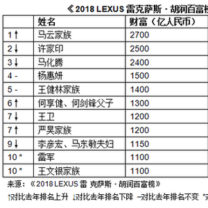 当然,在上榜的地产富豪中,出现财富缩水现象的不止许家印一人。《2018年胡润百富榜》中,碧桂园的杨惠妍和王健林与去年一样,分别位列第4位和第5位,两人对应的财富金额是1500亿元和1400亿元,与去年相比均有下降。此外,华夏幸福王文学及融创孙宏斌的财富分别缩水15%和36%,排名分别下滑12名和24名。