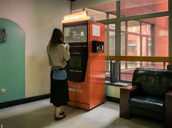 目前,莱杯咖啡已在全国设置1500个点位,图为清华大学学生在校园内饮用莱杯所提供的现磨咖啡。摄影:邓攀