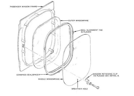 而中层和外层玻璃才是真正的结构玻璃,用于承受气压差带来的力量,保证飞行安全。尤其是外层玻璃,其实际上是窗户区域在飞行过程中的真正承担压力的那一块部件。
