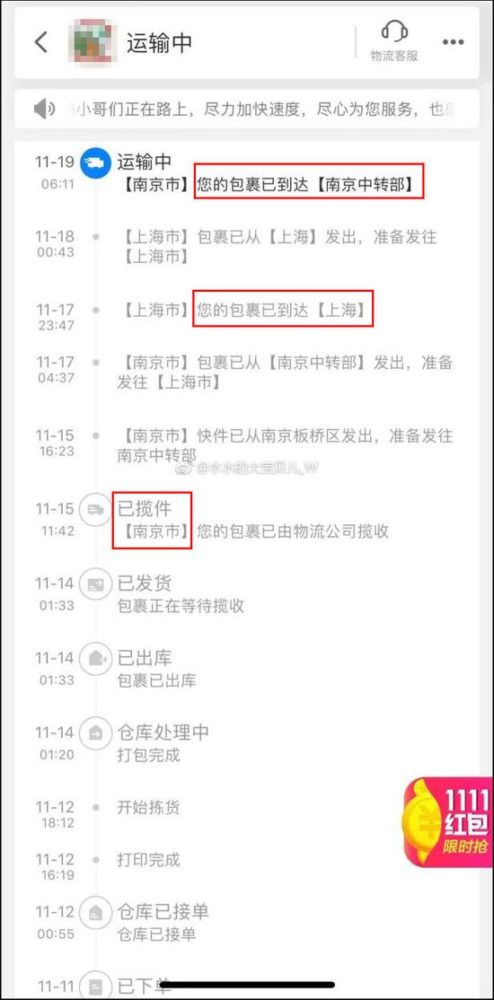 双11到今天已经过了10天了,很多人的快递至今还没有动静,有人就去看了一眼自己的物流信息。
