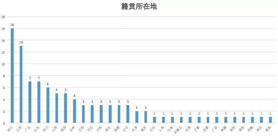一百人当中,北京、黑龙江、甘肃这三个省市没有人上榜。黑龙江、甘肃不是改革开放最前沿、最中心的地带,尚有可理解的地方。北京站在中国城市鄙视链的顶端,却没有一个帝都人上榜。看来皇城根脚下长大的,也不一定都是上等人嘛。