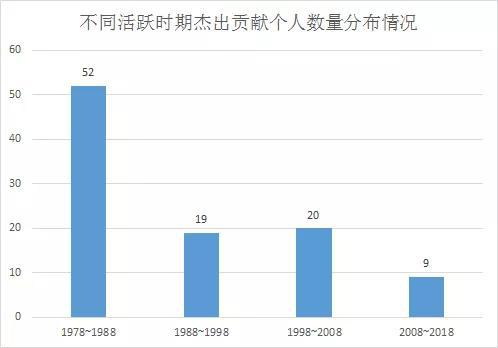 按照十年为一个单位,1978-1988年诞生/活跃着最多的人物,足足有52个人,占去了半壁江山。而最近十年,则是40年年来唯一个位数的阶段,只有9个人。