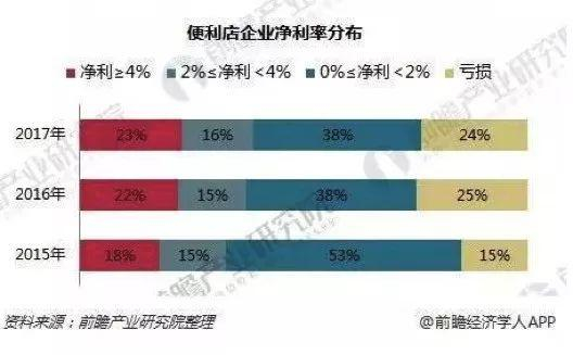 白热化的竞争倒逼着企业利润。前瞻产业研究院的报告显示,2017年,中国有24%的便利店企业处于亏损状态,另有54%的便利店企业的净利率不超过4%(0%~4%)。